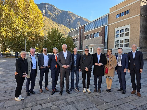 Am zweiten Tag führte die Reise die Delegation nach Bozen, wo sie den NOI Techpark und die Forschungseinrichtung Eurac Research besuchte. Zunächst erhielten die Präsidentinnen und Präsidenten der bayerischen HAWs/THs eine Führung durch den NOI Techpark, in dem verschiedene Unternehmen, Start-ups, Forschungseinrichtungen und Labore untergebracht sind. Hier arbeiten Wissenschaft und Wirtschaft eng zusammen, um praxisnahe und nachhaltige Innovationen für aktuelle gesellschaftliche Herausforderungen zu entwickeln. Daran anschließend präsentierte Prof. Dr. Roland Psenner, Präsident von Eurac Research, den Teilnehmenden das multidisziplinäre Institut, in dem anwendungsorientiert in den Bereichen grüne Energien, Technologien für Umweltbeobachtung, Klimasimulation, Biomedizin und Mumienforschung geforscht wird. Im Folgenden stellte der Vorsitzende von Hochschule Bayern und Leiter der Delegation, Prof. Dr. Walter Schober, den Gastgebern den Wissenschaftsstandort Bayern und die Rolle der HAWs und THs vor, bevor gemeinsam Möglichkeiten für Kooperationsprojekte zwischen bayerischen HAWs/THs und Südtiroler Forschungseinrichtungen ausgelotet wurden. Am Nachmittag besichtigte die Delegation das terraXcube, das Center for Sensing Solutions und das Institut für Erneuerbare Energien, wobei die Teilnehmenden Einblicke in aktuelle Forschungsaktivitäten in den Bereichen Klima, Energie und Sensorik erhielten.