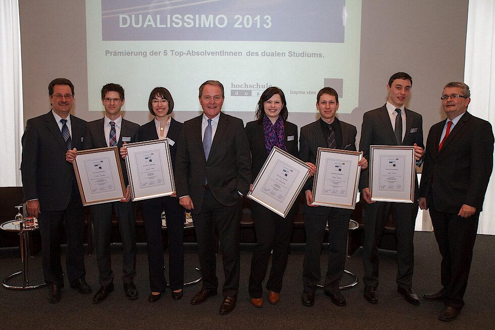 Bayerns Wissenschaftsminister Dr. Wolfgang Heubisch, der Hauptgeschäftsführer der Bayerischen Metall- und Elektro-Arbeitgeberverbände bayme vbm und der vbw - Vereinigung der Bayerischen Wirtschaft e. V., Bertram Brossardt, sowie der Leiter der Initiative "hochschule dual" und Präsident der Hochschule Kempten, Professor Dr. Robert F. Schmidt, zeichneten heute gemeinsam fünf herausragende Absolventinnen und Absolventen dualer Studiengänge mit dem Preis "Dualissimo" aus. Bereits zum dritten Mal wird der mit jeweils 3.000 Euro dotierte Preis an diejenigen Bewerberinnen und Bewerber verliehen, die ihr duales Studium an einer staatlichen Hochschule für angewandte Wissenschaften in Bayern mit der Note sehr gut abgeschlossen, in der betrieblichen Praxis durch ausgezeichnete Leistungen überzeugt und sich darüber hinaus auch sozial engagiert haben.