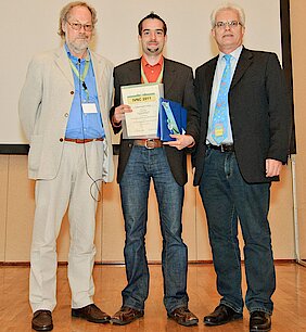 Auf der 24. Internationalen Vakuum Nanoelektronik Konferenz (IVNC) 2011 in Wuppertal haben drei junge Forscher der Hochschule Regensburg (HS.R) den "Young Scientist Award" erhalten. Die Jury verlieh ihnen den Preis für den besten Tagungsbeitrag. Florian Dams von der HS.R hatte Ergebnisse der Arbeiten zur Feldemission aus Silizium präsentiert. Das Thema bearbeitet er im Rahmen einer kooperativen Promotion im Labor von Prof. Dr. Rupert Schreiner an der Fakultät Allgemeinwissenschaften und Mikrosystemtechnik der HS.R. Dams nahm stellvertretend für die gesamte Arbeitsgruppe mit den zwei weiteren Doktoranden Christoph Langer und Christian Prommesberger von der HS.R den Preis entgegen.
